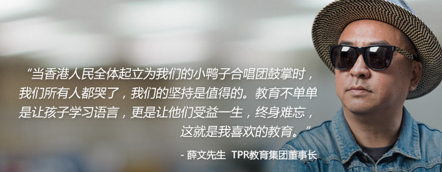 在TPR有一支鼎鼎有名的小鸭子英文合唱团。“我想通过合唱这种方式,让孩子们感受到学习的乐趣,提升英语的语感”。这是薛校长在教学之外的又一次跨界。为此薛校长甚至邀请到香港交响乐协会主席罗国治过来指导。“我们在香港开了一场演唱会,当香港人民全体起立为我们的小鸭子英文合唱团鼓掌时,我们所有人都哭了。”回忆起当时的盛况,薛校长忍不住再一次热泪盈眶。“教育不单单是让孩子们学习语言,更是让他们受益一生,终身难忘,这就是我希望的教育”。