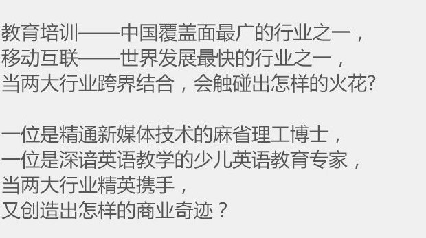 2004年,潘鹏凯从MIT毕业后回国创业,一直在探索如何用先进技术帮助国内孩子更好地学习。他利用语音识别技术,研发了SAYBOT播放器,但6年前,在线教育市场并没有成熟,业务发展屡屡受挫。而当时任迪士尼英语教学总监的唐威廉恰巧在事业发展过程中也遇到瓶颈,在努力地寻求更大的发展空间。2008年,潘博士把儿子送到了迪士尼英语学习口语,遇到了唐老师,两人一见如故,一拍即合,发挥各自的 优势,研发出一套混合立体英语教学产品体系——爱乐奇少儿英语。历经5年研发和改进,如今的爱乐奇少儿英语已经能为培训机构提供从教程设计到教学理念,再到美术设计、技术支持,教师培训等一整套智能教学解决方案。这两位少儿英语互动教材的先行者用自己的实践 诠释了何为科学技术与教育理念的艺术结合。
