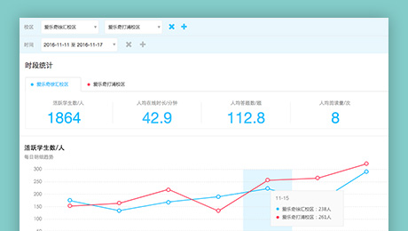 “孩子们每周上线几次?在平台学习多长时间?练习了多少习题?读了多少本书?不同校区有差异吗?同一校区不同时间段有差异吗?”这些数据在校长平台上都能一览无余,校区管理实现“到班化”。