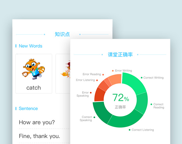 多媒体课件与教学内容自然结合,动画、声音等有趣的元素让孩子在愉悦中获得语言和认知的成长,丰富多样的课程内容与线下课本内容配套,加速学生的感知过程,优化教学效果。