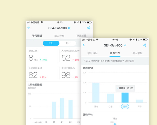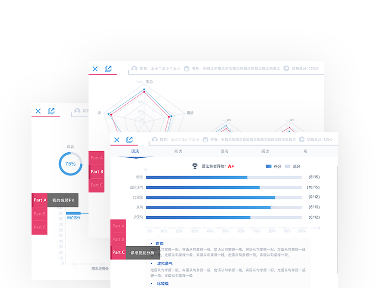 基于SoLoMo概念和大数据概念的 报告,不只有分数的罗列,更对知识点、水平程度的秒级反馈(能力雷达图分析、能力和水平的多维比较),学员的强项和弱点一目了然。