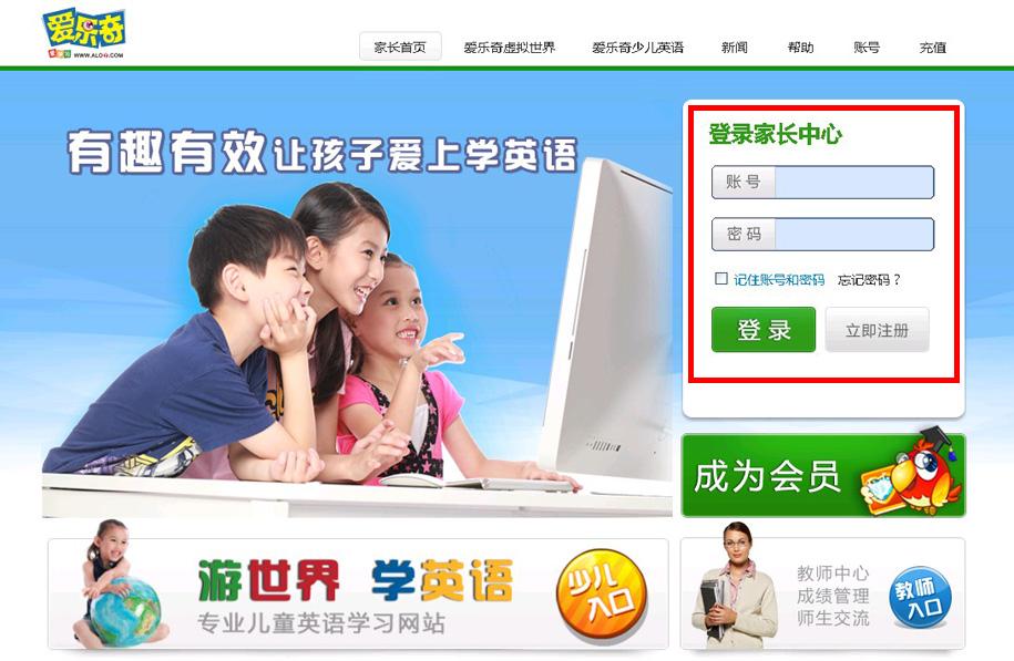 登录爱乐奇官网首页(WWW.ALO7.COM),点击页面左侧“家长入口“,进入家长中心